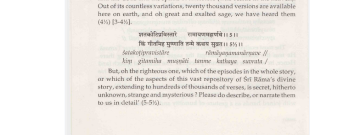 One question that may come up is with regard to this work — Moola Ramayana — containing 4 crore verses as stated in the above Puranas. However, one must remember that the number mentioned in many works also refer to the number of syllables in a given grantha. A massive work containing 4 crore aksharas is therefore very much possible.
